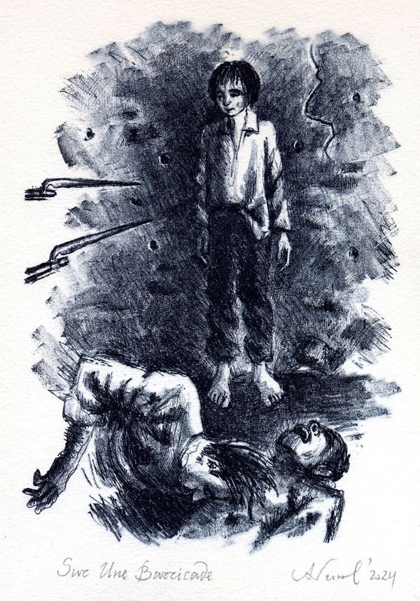 La plupart des œuvres graphiques de l'exposition actuelle représentent le thème des combats. Combattre pour survivre dans un monde hostile, mais survivre non seulement physiquement, mais surtout en préservant son esprit et son âme. Ce qui m'effraie, c'est que beaucoup de gens dans le monde semblent dépourvus d'âme. Dans mon art graphique, j'explore les méandres obscurs de la frontière entre la vie et l'au-delà. Le Dolmen de Gallardet, ce mégalithe visible dans l'Hérault est représenté dans une de mes lithographies, il n'apparaît pas seulement comme un monstre, mais aussi comme une porte vers l'autre monde.